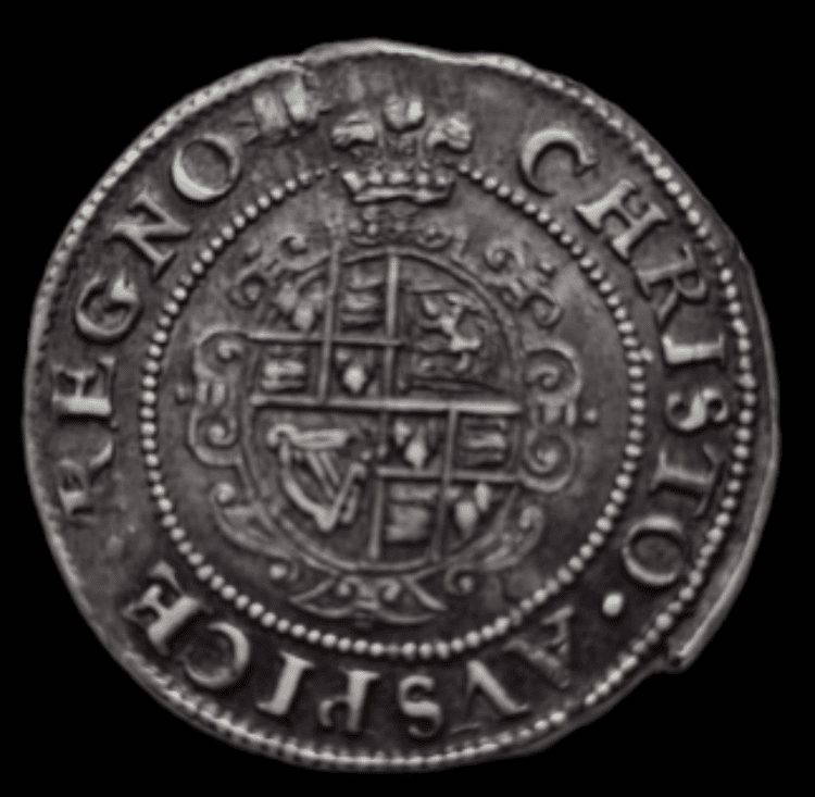 Reverse, oval framed quartered shield of arms, plumes above, initial mark book at end of legend, .CHRISTO. AVSPICE. REGNO, (S.2894, N.2340)