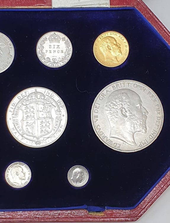 These “short gold” proof sets were produced to celebrate the Coronation of King Edward VII on the 9th August 1902 (having been postponed from 26th June due to the King’s appendicitis). The set had a mintage of 7,057 sets which less than the full “long” gold matt proof set. This year is the only time a matt finish set has been produced for a Coronation.