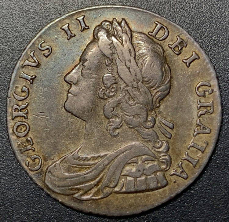 George II (1727-60), silver shilling , 1736, young laureate and draped bust left, legend and toothed border surrounding, GEORGIVS. II. DEI. GRATIA.