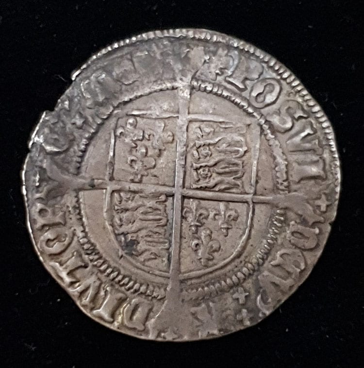 Larger squarer face with Roman nose and Lombardic lettering, mint mark lis, Henry VIII Crowned and draped bust right / Coat of arms over long cross fourchée